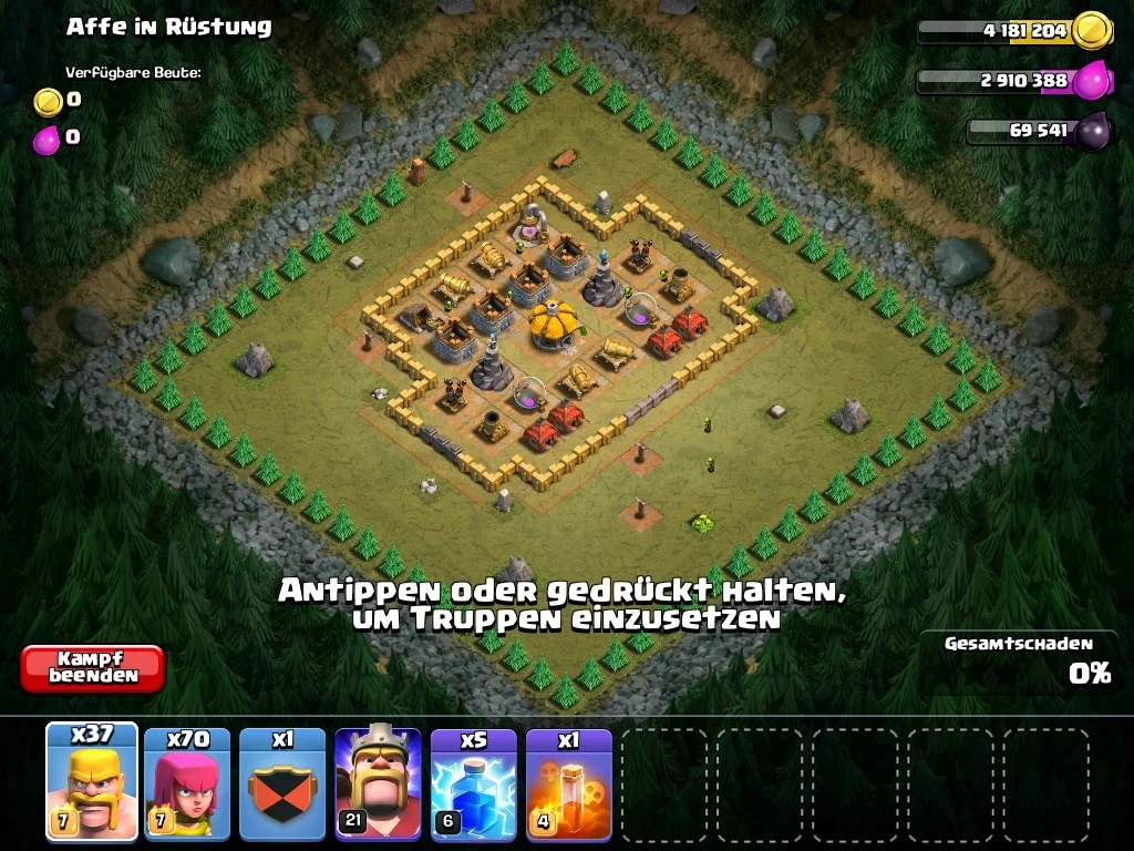 Truppen: 4 Mauerbrecher, 12-14 Riesen, 1 Ballon
