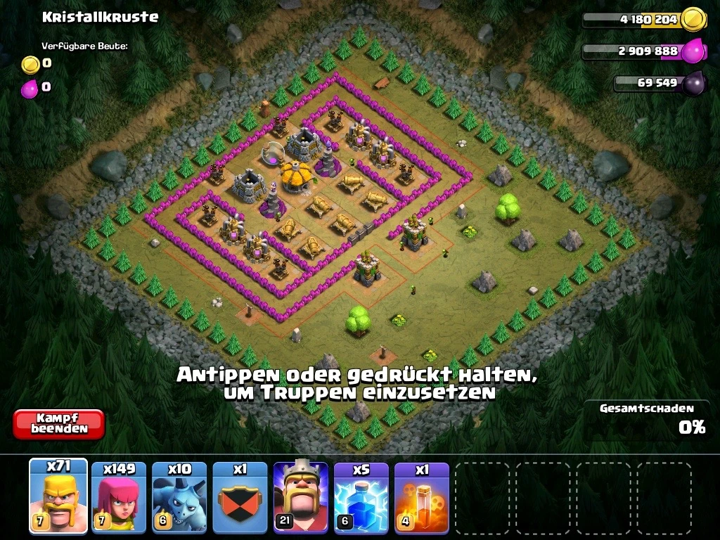 Ablauf: An den Rand werden ein paar Bogenschützen gesetzt, um die Mauern zu zerstören. Wichtig ist, dass sie nicht von der Verteidigung getroffen werden oder im Radius der Verteidigungen gelangen.