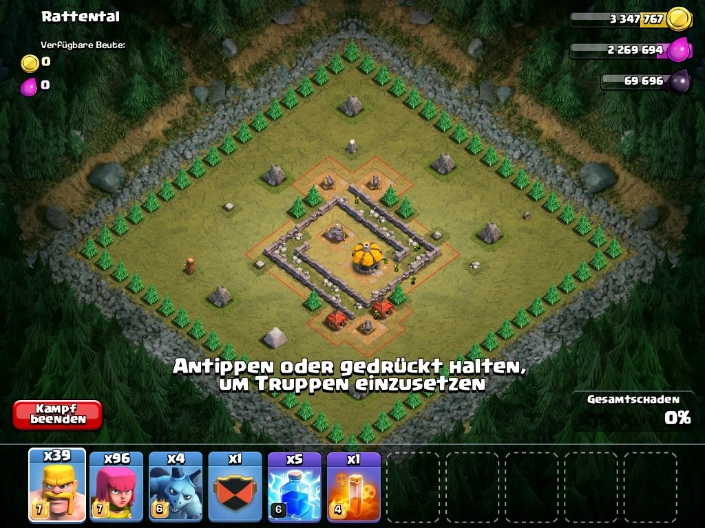 Ablauf: 6 Barbaren auf jede Kanone ansetzen. Sobald die zerstört sind, oben und unten je einen Bogenschützen setzen; die über die Mauer hinweg auf Rathaus bzw. Elixierlager schießen. Soll es etwas schneller gehen, einfach mehr Bogenschützen einsetzen.