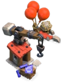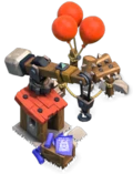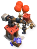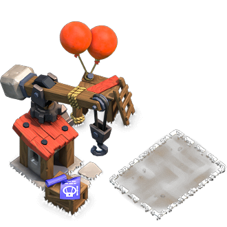 - Au niveau 3, un gros rocher apparaît à la place de la plate-forme en bois. Un troisième ballon rouge est ajouté et la flèche de la grue est renforcée de métal. Le plan du dirigeable est à nouveau enroulé et placé sur le côté, avec un nouveau plan d'une montgolfière visible, ce qui montre la capacité de l'atelier à construire des Broyeur de pierre . Un troisième contour blanc apparaît dans l'herbe, indiquant la capacité de l'atelier à contenir trois engins de siège.