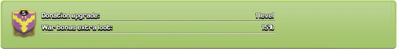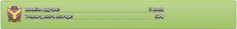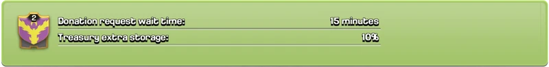 | Clan Level | Clan XP Required | Donation Request Wait Time | Donation Limit | Donation Refund | Donation Upgrade | Treasury Extra Storage | War Bonus Extra Loot | |