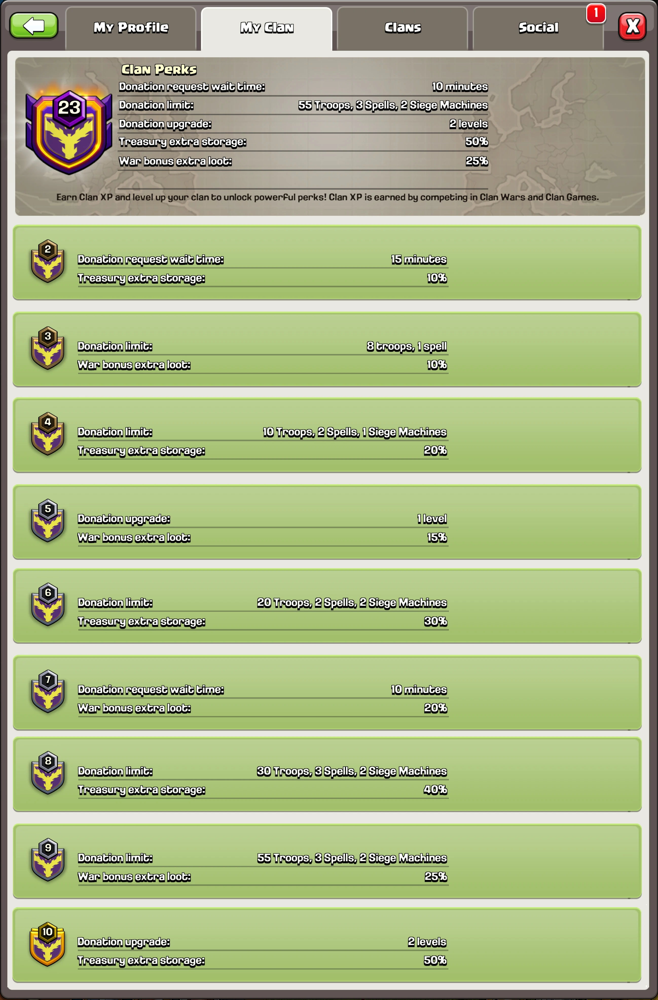 Donation upgrade: This perk will automatically upgrade troops, spells, and siege machines that are donated. This perk is improved twice, at Clan levels 5 and 10, and both increase the upgrade amount by 1 level. Note that this perk will not upgrade donated troops, spells and siege machines past the maximum level allowed in the receiving Clan Castle.