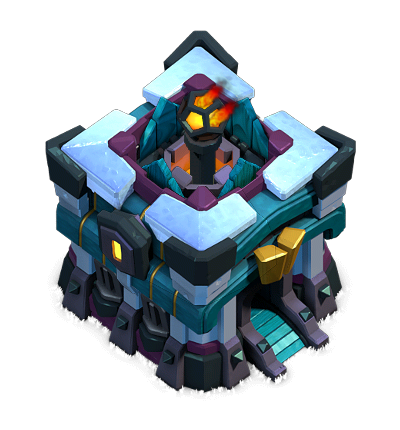 - When activated, the light from the bottom floor extinguishes, the triangular wooden panels open, and a circular pillar with a golden ring lifts up a bigger multi-target Inferno Tower with a dodecahedron frame that is flaming. The pillar and frame are made of the deep green metal, with supports down the side of the frame. The square platform are made of purplish gray stone. The ring has a large, orange-hot tube fed into it. The edges of the hole have some protruding stone. Inside of Town Hall is brightly lit up, which slowly fades to black and occasionally lights up again. The ice supports can create some water vapor while it is active. When the Town Hall is destroyed, the frame falls down and overloads itself, creating an icy explosion, which slows down enemy units in its radius. An orange aura occasionally appears in the right of the rod.