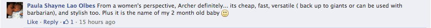 The winning comment was made by Paula Shayne Lao Olbes, supporting Archers. She said: